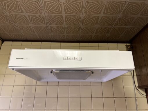 After写真では、Panasonic製の最新レンジフードが設置された様子をご確認いただけます。ターボファンを採用しており、従来機よりも効率よく煙や臭いを排出できる仕様となっています。また、風圧式の逆流防止シャッターが備わっているため、外気の侵入を防ぎ、安定した換気が可能です。